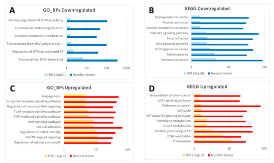 Diagram of common enriched functions (GO_BPs: Gene Ontology biological processes, and KEGG pathways) in the downregulated (A,B) and upregulated probes (C,D) in response to wounding in both groups (C24vsC0 and D24vsD0). The complete list of enriched GO_BPs and KEGG pathways is available in Table S4 (sheet tabs A and B).
