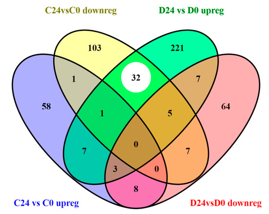 Venn diagram of the number of functions (Gene Ontology biological processes and KEGG pathways) altered in unique probes up and downregulated in C24vsC0 (1668 DE probes) and D24vsD0 (2784 DE probes) groups, respectively. White circle shows coincident functions altered by genes with opposite regulation (upregulated in D24vsD0 and downregulated in C24vsC0).