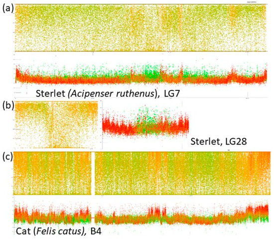 Comparison of the two major options of setting of GC% and rep% visualization with our tool with the default sliding window size 1 kbp. (a) One macrochromosome of sterlet, where GC% is represented by the color-scale mimicking the CMA3-fluorescence staining in the upper panel (GC-rich in red, AT-rich in green) compared with the swapped setting, where GC% is plotted as a profile and rep% as the color-scale in the lower panel; (b) the same for one microchromosome of sterlet; (c) B4 of cat as an example of a mammalian LG.
