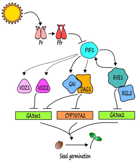 The VASCULAR PLANT ONE-ZINC FINGER 1 and 2 (VOZ1 and VOZ2) were recently added as downstream elements of the phyB-PIF1 signaling pathway; VOZ1 and VOZ2 transcription factors have been previously characterized as phyB-interacting proteins which redundantly promote flowering [23]. Interestingly, it has been demonstrated that voz1voz2 double mutant seeds—conversely to the single voz1 and voz2 mutants—show a higher germination rate than the wild type under phyB-off conditions, (after a pulse of far red light), suggesting that the VOZ proteins redundantly repress phyB-mediated seed germination [24]. The expression level of both VOZ genes is downregulated during imbibition in the light; in addition, in pif mutant seeds, expression of VOZ genes was reduced irrespective of light conditions, indicating that VOZ1 and VOZ2 act downstream PIF1 which induces their expression in the dark [24]. By means of a ChIP assay, it was proved that VOZ2 directly binds the GA3ox1 promoter to repress its expression, consistent with increased expression level of the GA3ox1 gene in voz1voz2 double mutant seeds [24]. Interestingly, this scenario is very reminiscent of the one previously shown for the DAG1 protein, which is induced indirectly by PIF1 and, in turn, represses GA3ox1 expression to inhibit phyB-dependent seed germination [18,25]. It is tempting to figure a signaling pathway underlying light-mediated seed germination in which all these molecular elements might merge (Figure 1); further studies will be needed to unveil the genetic and molecular relationships between PIF1 and downstream factors, as well as between DAG1 and VOZs, or RGL2 and GAI. The result will be of remarkable interest not only for basic research but also to improve the yield of species of agronomic interest.