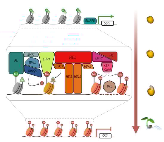 The transition from seed dormancy to germination is finely regulated by different partially overlapping mechanisms, among which the epigenetic control plays a key role. Indeed, genes specifying seed development, maturation, and dormancy, as well as genes required for the accumulation of seed storage compounds, must be sequentially repressed by chromatin-based modifications, to allow the embryo to differentiate into an autotrophic organism [108]. Among these genes, the most relevant are LEAFY COTYLEDON 1 (LEC1), ABA INSENSITIVE 3 (ABI3), FUSCA 3 (FUS3), and LEC2, termed LAFL [8], encoding the master transcriptional regulators of seed development. These factors in turn control a number of maturation and dormancy genes like the storage compound genes, CRUCIFERIN 3 (CRU3), CRUCIFERINA 1 (CRA1), SEED STORAGE ALBUMIN 1 and 2, (SESA1 and 2), and the dormancy regulators SOMNUS (SOM), DELAY OF GERMINATION 1 (DOG1) and DOF AFFECTING FACTOR 1 (DAG1) [6,9,109]. The establishment and maintenance of epigenetic repression of all these genes upon germination and vegetative growth is mainly accomplished by PcG (Polycomb Group) proteins through the Polycomb Repressive Complex 1 and 2 (PRC1, PRC2), and by the acetylases/deacetylases system and chromatin remodeling complexes, although the latter are so far less characterized.