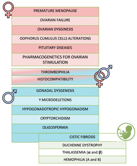 ® is a customized next generation sequencing (NGS) panel that allows to simultaneously analyze: (1) genes related to genetic causes of both male and female infertility; (2) disease-genes of common hereditary diseases (cystic fibrosis, Duchenne’s dystrophy, hemophilia A and B and thalassemia); and (3) variants in genes coding for gonadotropins and their receptors and related to controlled ovarian stimulation outcomes. In addition, although the association between fertility and