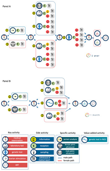 Figure 4A. The key activities, i.e., the medical examination, the diagnostic investigations (execution of instrumental and/or laboratory tests), and genetic tests are highlighted. Diagnostic investigations include traditional laboratory tests (for example, hormonal profile assessment for women and semen analysis for men), genetic tests (for male are karyotype, analysis of Y microdeletions and of CFTR gene; for female are genes related to thrombophilia and to recurrent pregnancy loss) and also specific pelvic ultrasound. Each of these actions involves a series of repeated side actions (i.e., the collection of logistical information, booking, acceptance, execution of the investigation, waiting time, and, finally, the withdrawal of the report). This operation management analysis has allowed us to highlight the key and side activities, the decision-making steps and the bottlenecks of the whole, actually performed, process.