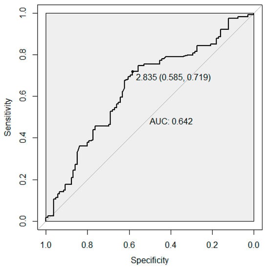 Receiver operator characteristic (ROC) curve for the predictive ability of the genetic risk score (GRS) for recurrent pregnancy loss. The best predictive point is shown with the ideal cut-off for the GRS and with estimates for specificity and sensitivity at that point. Abbreviation: AUC, area under the curve.