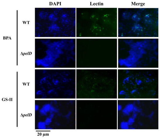 - Whitfield, G.B.; Marmont, L.S.; Ostaszewski, A.; Rich, J.D.; Whitney, J.C.; Parsek, M.R.; Harrison, J.J.; Howell, P.L. Pel polysaccharide biosynthesis requires an inner membrane complex comprised of PelD, PelE, PelF, and PelG. J. Bacteriol. 2020, 202, e00684-19. [Google Scholar] [CrossRef]