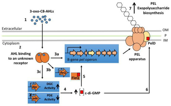 - Ueda, A.; Wood, T.K. Connecting quorum sensing, c-di-GMP, pel polysaccharide, and biofilm formation in Pseudomonas aeruginosa through tyrosine phosphatase TpbA (PA 3885). PLoS Pathog. 2009, 5, e1000483. [Google Scholar] [CrossRef]