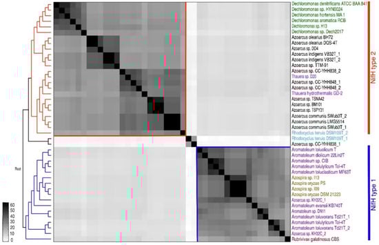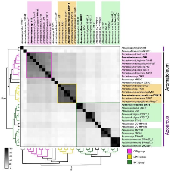 Average nucleotide identity (ANI) of whole genome comparison of 32 (18 database and 14 newly sequenced) Azoarcus and Aromatoleum genomes from 30 strains showing subgroups of the known genera Azoarcus and Aromatoleum. The depicted heatmap is a matrix generated by FastANI, ordered according to the dendrograms (left/below) obtained with the neighbour joining clustering method in MATLAB, considering upper and lower triangular complementary ANI dissimilarity matrices as input. All genome accession numbers are listed in Table 1 and Table S1a.