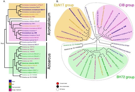 In summary, although it should be stressed that the 30 strains presented in Figure 2B are only a “snapshot” of the habitats of Azoarcus-Aromatoleum strains, and their selection for our analysis is inevitably biased by the requirement for fully genome-sequenced strains, it is, nevertheless, clear from the present study and from perusing the databases for deposited gene sequences that water, sludge, and soil (contaminated and uncontaminated) are the principal habitats of all three Azoarcus-Aromatoleum groups. Plants are not a common habitat; only three strains in our analysis were actually isolated from plants (i.e., Kallar Grass), and all of these were from a single field in Pakistan [,]. Moreover, in each case, these plant-associated strains (Az. olearius BH72, Az. communis Swub3T, and Az. indigens VB32T) have sister strains in the same (or closely-related) species that were not isolated from plants such as Az. olearius DQS-4T (oil-contaminated soil; []), Az. communis LMG 5514 (refinery oil sludge; []), and Azoarcus sp. TTM-91 (river water; this study). Other examples are Azoarcus sp. DD4, which is quite closely related to Az. olearius and may belong to this species (Figure 2A,B); this was isolated from activated sludge from a wastewater treatment plant []. Moreover, the other genome-sequenced strains in the Az. communis species complex (BM101, TSPY31, TSNA42), were isolated from sediments. Therefore, even though Azoarcus was the only group in the present study that contained plant-associated strains/species, these were few in number, and the most intensively studied among them, Az. olearius BH72, did not appear to possess genes that make it any more specialised in terms of associating with plants than its non-plant-associated sister Az. olearius DQS-4T []. Therefore, widely used terms in the literature like “the plant-associated Azoarcus genus/group” (see Introduction) should henceforth be avoided as these give a misleading impression about the much wider habitat preferences of Azoarcus.