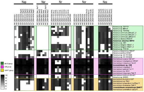 Nitrate reduction pathway analysis. Heatmap revealing the presence/absence of genes from the nap, nar, nir, nor, and nos gene clusters from 32 genomes (from 30 strains) of the Azoarcus-Aromatoleum group. The indicated marker genes were identified in the RAFTS3G-32 clusters containing corresponding genes in Aromatoleum sp. CIB and verified manually. The homology of the identified genes to reference genes is indicated with a grey scale gradient from white (0%) to black (100%).