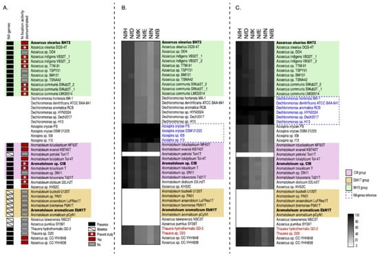 Functional analyses of the nif clusters and nifH gene were performed for all 67 genomes. Analyses of the denitrification pathway and of aromatic compound degradation were performed only for the Azoarcus-Aromatoleum group.