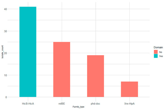 Isolate count per toxin-antitoxin (TA) family type. Bar lengths correspond to the number of isolates containing TA systems belonging to a given TA family. Blue bars represent TA systems where both toxin and antitoxin genes harbor a TA-related domain, while red bars represent TA systems where either the toxin or antitoxin gene harbor a TA-related domain.