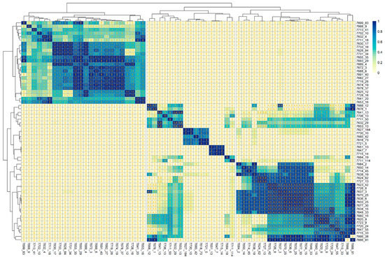 In this study, we sought to characterize the TA systems in a diversified set of Campylobacter isolates with a sparse genomic organization. Hence, it is crucial to assess the homology and the degree of conservation between the isolates in terms of their constituent TA systems. Additionally, despite the fact that most TA systems are scattered in different regions across the genome, the synteny between those regions or so-called blocks between different isolates should be conserved. Therefore, we quantified the syntenic blocks between all pairs of contigs that are known to contain a TA system; we restricted the analysis only to contigs containing TA systems to increase the signal-to-noise ratio compared to a whole-genome comparison. The shared synteny between two respective contigs was quantified using the hits coverage, as described above. The contigs were then hierarchically clustered based on the coverage, and the TA systems found in each contig pair were overlaid to show which cluster of contig pairs shared a specific TA system (Figure 5). Some clusters showed high synteny and were significantly enriched in only one TA system, such as those contig pairs containing TADB|4371 (HicB-HicA) and TADB|1511 (Xre-HipA). Interestingly, there were some clusters containing contig pairs that shared two TA systems in each contig, such as (phd-doc and relBE) or (relBE and HicB-HicA), so, in those isolates, those two TA systems could coexist together.