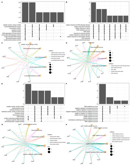Functional enrichment analysis. (A–D) Show the enrichment analysis of the cluster involving lexA as the seed node, and (E–H) show the enrichment results of the cluster involving yafQ-hicA-hicB as seed nodes (Figure 6). In panels (A,B,E,F), upset plots are drawn to visualize the intersection between the gene ontology (GO) terms in a given ontology (horizontal labels). Every possible intersection is represented by the bottom plot, and the frequency (i.e., number of genes) is shown on the top vertical bar plot. In panels (C,D,G,H), circular gene-concept networks are drawn to visualize the interaction between each gene and its associated GO term. The edges are colored according to the GO term, and the node size reflects the number of genes associated with each category. Panels (A,C,E,G) correspond to enrichment results for GO “molecular function” ontology, while panels (B,D,F,H) correspond to enrichment results for GO “biological process” ontology.