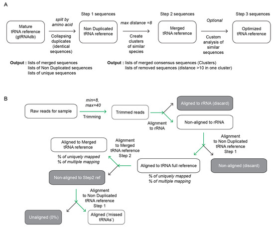 Strategy to create and validate a tRNA reference sequence. Panel (A)—collapsing of tRNAScan-SE predicted tRNA genes in non-duplicated (non-redundant) tRNA reference followed by further optimization (Step 2) by merging of closely related sequence (distance ≤ 8 by default). Further improvements may be introduced in a manual mode, by analysis of residual redundant mapping. Panel (B)—experimental analysis and validation of proposed tRNA reference sequences. Raw sequencing reads obtained in SR50 mode are trimmed and first filtered by alignment to rRNA reference sequence of the organism. Non-mapped reads are aligned to Step 1 (non-redundant) tRNA sequences. Mapped reads are re-aligned to Step 2, optimized reference and % of total and unique mapping are calculated. Finally, non-mapped Step 2 reads are re-analyzed by alignment to Step 1 reference, to get “missing tRNAs”.