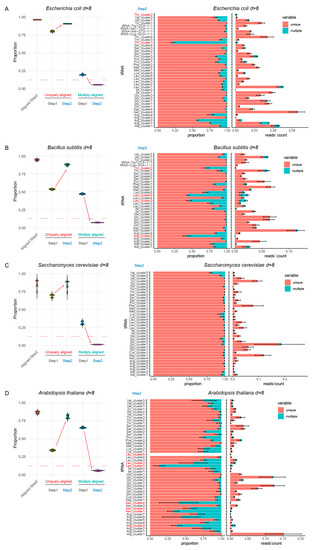 Alignment results for non-duplicated (non-redundant) tRNA reference (Step 1) and optimized tRNA set (Step 2) for four model species, with a maximum distance of eight substitutions. Panels (A–D) show analysis of Escherichia coli, Bacillus subtilis, Saccharomyces cerevisiae and Arabidopsis thaliana tRNA references, respectively. Boxplot on the left shows the proportion of tRNA sequencing reads aligned to Step 2 reference (“Aligned Step 2”) and proportions of uniquely and multiply mapped reads at both steps. Red dashed lines indicate the 12.5% level. The increase of unique mapping events and the decrease of multiple mapping events are shown by arrows. Barplots at the right represent unique and multiple mapping by tRNA species at Step 2, in proportion to total and in absolute number of sequencing reads obtained by tRNA, expressed as proportion to total number of mapped reads. tRNAs showing excessive proportion of ambiguous mapping are shown in red.