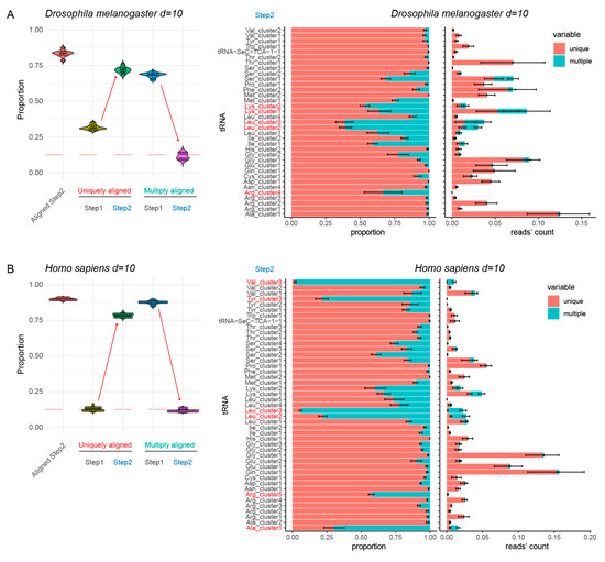 Alignment results for non-duplicated (non-redundant) tRNA reference (Step1) and optimized tRNA set (Step 2) for two complex model species, maximal distance used is 10 substitutions. Panels (A,B) show analysis of Drosophila melanogaster and Homo sapiens tRNA references, respectively. Boxplot on the left shows the proportion of tRNA sequencing reads aligned to Step2 reference (“Aligned Step 2”) and proportions of uniquely and multiply mapped reads at both steps. Red dashed line indicates 12.5% level. Increase of unique mapping and decrease of multiple mapping is shown by arrows. Barplots at the right represent unique and multiple mapping by tRNA species at Step2, in proportion to total and in absolute number of sequencing reads obtained by tRNA, expressed as proportion to total number of mapped reads. tRNAs showing excessive proportion of ambiguous mapping are shown in red.