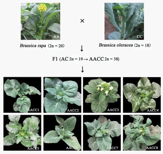 - Cui, C.; Ge, X.; Zhou, Y.; Li, M.; Li, Z. Cytoplasmic and genomic effects on non-meiosis-driven genetic changes in Brassica hybrids and allotetraploids from pairwise crosses of three cultivated diploids. PLoS ONE 2013, 8, e65078. [Google Scholar] [CrossRef]
