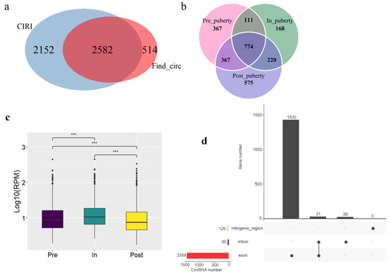 Overview of the identified circRNAs by RNA-seq analyses in ovaries of gilts. (a) The circRNAs were identified by two algorithms (CIRI and find_circ). (b) The number of unique and common circRNAs during pre-, in- and post-puberty. (c) Expression level of circRNAs in the pre-, in- and post-puberty stages. (d) The number of three types of circRNA and the number of corresponding parental genes. *** p < 0.001.