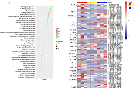The Key signaling pathway of CirRNAs in pubertal transition. (a) KEGG analysis of all identified circRNAs (p < 0.05). (b) Expression level of circRNAs involved in pubertal key pathways in pre-, in- and post-puberty.