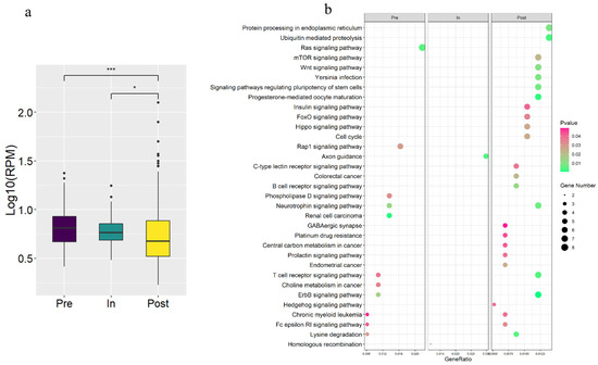 Analysis results of stage-specific circRNAs. (a) Expression level of stage-specific circRNAs during Pre-, In-, Post-puberty. (b) KEGG analysis with parental genes of stage-specific circRNAs during pre-, in-, post-puberty (p < 0.05). * p < 0.05, *** p < 0.001.