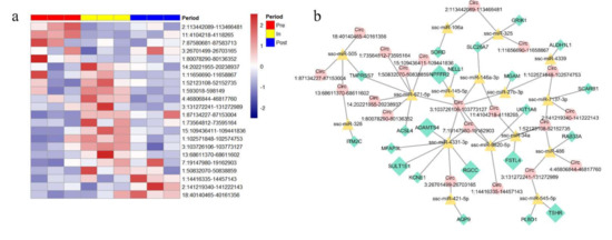 Analysis of differentially regulated circRNAs. (a) Heatmap of differentially expressed circRNAs in pubertal transition. (b) Differentially expressed circRNAs interact with differentially expressed genes via miRNAs and the differentially regulated status was show in Tables S6 and S7. The red circle represented circRNAs, the yellow triangle represented miRNAs, the green diamond represented genes.