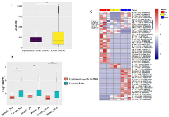 Analysis results of hypothalamus-specific circRNAs. (a) Length of tissue-specific circRNAs and known circRNAs. (b) Significant difference analysis between hypothalamus-specific circRNAs and known circRNAs. (c) The expression of hypothylamus-specific circRNAs in three stages, the blue box represents circRNAs and its parental genes without variation. *** p < 0.001.