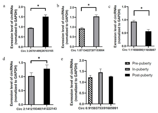 In order to explore the putative functions of differentially expressed circRNAs, we identified a total of 22 differentially expressed circRNAs (Supplementary Table S6) and showed the expression in Figure 4a. Thereinto, 11 differentially up-regulated circRNAs and three differentially down-regulated circRNAs were identified in the pre- vs. in-puberty group; two differentially up-regulated circRNAs and four differentially down-regulated circRNA were identified in the pre- vs. post-puberty group; two differentially up-regulated circRNAs and five differentially down-regulated circRNA were identified in the in- vs. post-puberty group (Supplementary Table S6). Later, circRNAs mentioned above were used to predict the binging sites, and the top three possible miRNA targets were listed in Table 1. After that, differentially expressed genes were used to predict the circRNA-miRNA-gene regulatory network (Figure 4b). Noticeably, we highlight FSTL4, TSHR, SULT1E1, NPFFR2, RGCC, and ADAMTS4 genes, which were associated with puberty [34,35,36,37,38,39] (Supplementary Table S7). Interestingly, one of these differentially expressed circRNAs, “circ 11:4104218-4118265” that interacted with FSTL4 via ssc-miR-34a, was down-regulated in the pre- vs. in-puberty groups, as well as down-regulated in the pre- vs. post-puberty groups (Supplementary Tables S6 and S7). In addition, “circ 3:103726106-103773127” was up-regulated in the pre- vs. in-puberty groups but down-regulated in the in- vs. post-puberty groups (Supplementary Table S6), and this circRNAs interacted with SULT1E1 via ssc-miR-4331-3p (Supplementary Table S7). According to this result, we found that some differential expression of circRNAs interacted with differentially expressed genes via miRNAs, whereafter they potentially regulate the onset of puberty.
