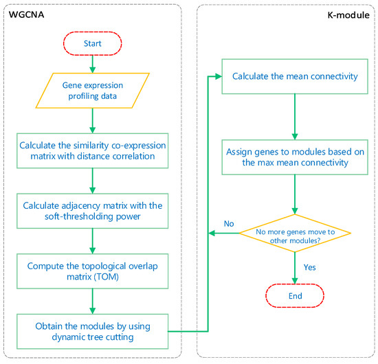 In this study, we sought to obtain modules with highly correlated member genes, so we designed the k-module algorithm to improve the clustering results of WGCNA. The flow chart of our algorithm is shown in Figure 1. The flow chart is divided into two stages: WGCNA and the k-module algorithm.