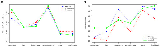 Silhouette coefficient score (a) and Dunn validity index (b) of WGCNA, k-eigengene, and k-module algorithms. The evaluation value obtained by the k-module algorithm was the highest in most of the datasets.