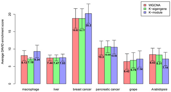Co-expressed genes tend to be involved in the same biological processes [29]. The network modules often have a biological interpretation in the sense that the modules are highly enriched in genes with a common functional annotation [30]. Ideal modules should be highly enriched for specific gene categories [18]. In this paper, we used DAVID [22,23] for enrichment analysis and took the enrichment score in the DAVID Functional Annotation Clustering Tool. The overall enrichment score for the module was based on the expression analysis systematic explorer (EASE) score of each term member: the higher the score, the more enriched the module. Next, we measured the enrichment of the co-expression network using the average DAVID enrichment score for all modules. As the enrichment score is an important evaluation of the modules’ rationality, we discuss the enrichment scores of the gene co-expression networks constructed by WGCNA, the k-eigengene, and the k-module algorithms. The average DAVID enrichment scores of modules obtained by WGCNA, the k-eigengene, and the k-module algorithms are shown in Figure 3. The gene number and DAVID enrichment score of each module can be found in Supplementary Material 5 (Table S3).