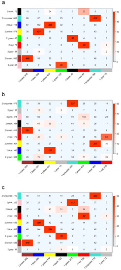 To determine the stability of the modules obtained by WGCNA, the k-eigengene, and the k-module algorithms, we randomly divided the liver data into two parts, and each half was independently processed using the three algorithms. To observe the module preservation between each partition of the liver dataset for the three algorithms, we examined the preservation significance, as shown in Figure 5. The numbers in Figure 5 indicate gene counts in the interaction of the corresponding modules. As the grey module consisted of genes not assigned to any module, it did not overlap with other modules.