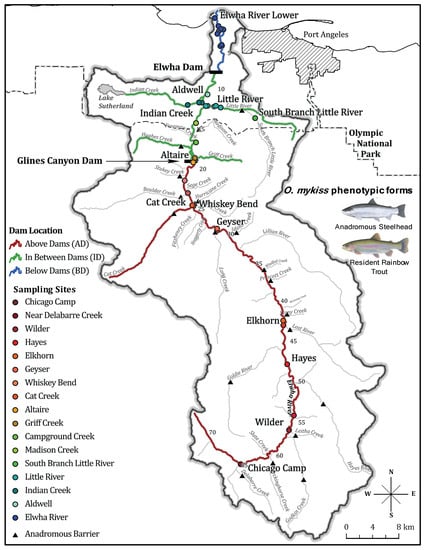 - Winans, G.A.; Baker, J.; McHenry, M.; Ward, L.; Myers, J. Genetic Characterization of Oncorhynchus mykiss Prior to Dam Removal with Implications for Recolonization of the Elwha River Watershed, Washington. Trans. Am. Fish. Soc. 2017, 146, 160–172. [Google Scholar] [CrossRef]
