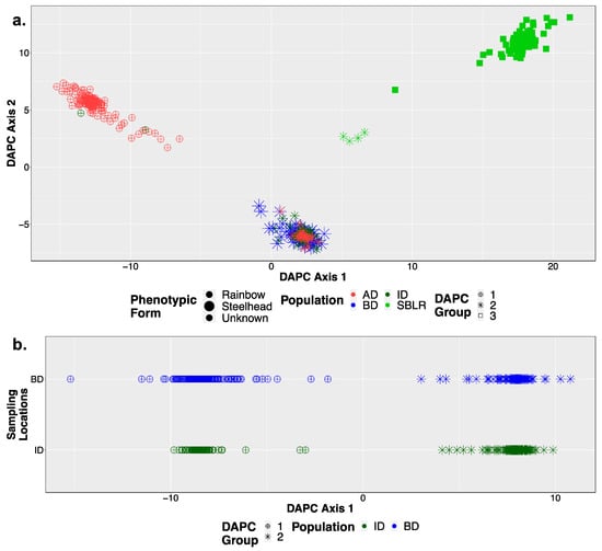 DAPC supported K = 3 genetic clusters prior to dam removal (a) and K = 2 genetic clusters following dam removal (b), note the points are split by sampling location for visualization. Shapes were indicative of population assignment by DAPC (DAPC Group) and color was based on population. Larger points in (a) were indicative of the steelhead life history phenotypic form while smaller points were indicative of the resident rainbow trout form or fish that could not be categorized in either form.