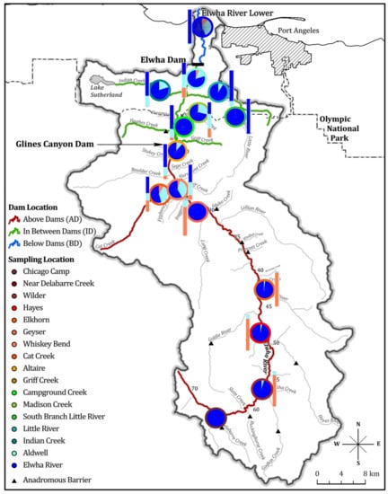 Dams built without fish passage prevent ocean migration and restrict movement of aquatic organisms throughout the river. The construction of the impassable Elwha River and Glines Canyon dams, completed in 1913 and 1927, respectively, on the Olympic Peninsula north of Port Angeles, WA, present one such example. These dams fragmented the river into three sections: seven river kilometers (rkm) below the dams, 47 rkms in between the dams, and >70 rkms above both dams [,]. Ultimately, large population declines of anadromous fish populations, riverbank instability, coastal erosion, reduction in habitat quality, and public pressure culminated in the Elwha River Restoration Act in 1992 [,,,]. River restoration began with removal of the Elwha River and Glines Canyon Dams in 2012 and 2014, respectively, increasing access to over 120-river kilometers of historical spawning grounds to anadromous fishes [,,]. Previous genetic work on O. mykiss in the Elwha River prior to dam removal identified genetic differentiation among populations separated by anadromous barriers, and natural and hatchery origin steelhead using thirteen microsatellites []. While this provided insight into how habitat fragmentation due to dams impacted O. mykiss population structure, the impacts of dam removal remain unexplored.