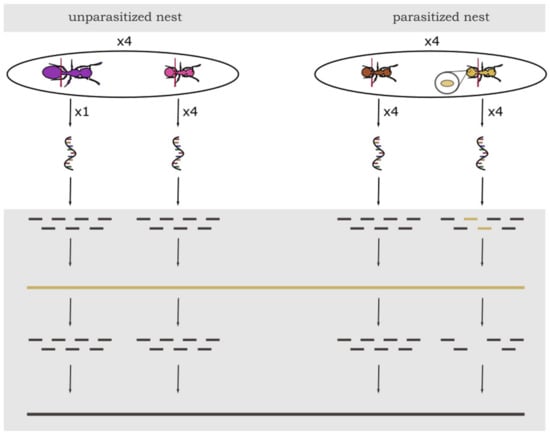 To remove all remaining cestode RNA and other putative contaminant sequences from all samples, we used FastQScreen (Babraham Institute, Cambridge, UK) with the newly assembled and filtered cestode transcriptome, sequences from humans, Escherichia coli, vectors, and adapters [31]. Detailed information about the assembly of the cestode transcriptome can be found in the Supplementary Materials. The infection status of worker pools from parasitized colonies was determined by identifying those four samples with a high percentage of cestode RNA (between 14 and 21%, see Supplementary Materials, Table S7).