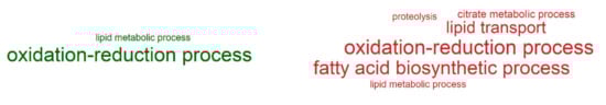 We sequenced the RNA of abdomens from infected and uninfected ants from parasitized nests as well as from queens and inside workers from unparasitized nests. Sequencing resulted in ~15 million 75 bp single-end reads per sample with an average GC content of 43.6% and a mean coverage between 13 and 18× (see Supplementary Materials, Table S8). These RNA reads were filtered for cestode RNA as cysticercoids are located in the ants’ abdomen. Moreover, we filtered the transcriptome to only contain transcripts with an open-reading frame at least 150 bp long and the gene count matrix for only those genes having at least 5 counts in at least 3 samples. After filtering, a total of 15,578 genes remained for further analysis. To gain insights into the significance of infection status on the general gene expression pattern, we conducted a PCA based on the overall read counts of these genes and tested the influence of infection status (infected or not) on each of the 16 principal components. Only PC2 and PC16 were found to be significantly influenced by infection status (Wilcoxon, PC2: W = 1, p = 0.002; PC16: W = 0, p = 0.001). As the latter explained less than one percent of the variance, we will focus on PC2 explaining 15% of the variance. Our samples clustered according to their group and infection status on PC2 (Figure 2a). Only the queens diverged from this pattern and showed the highest variance. As queen samples were derived from a single individual and not a pool of four individuals, it is not surprising they showed most within-group variance. While the queens from colonies 1 and 3 clustered near workers from the same nest, the queen samples from colonies 2 and 4 clustered between the infected workers and their nestmates. These latter two queen samples likely originated from older colonies, as their colonies contained more workers (117 and 132 workers vs. 59 and 76 workers). We were especially interested in genes contributing to PC2, where presumably older queens and infected workers clustered together, as these might correspond to age/longevity. Amongst the ten genes with the highest loadings on PC2, we found one encoding for transferrin, which is known to play a role in the innate immune system (see Supplementary Materials, Figure S2). The gene with the highest loading was encoding bromodomain-containing protein 4-like isoform X1 in Vollenhovia emeryi, important in epigenetic memory in humans (UniProt). The enriched Gene Ontology (GO) terms in genes contributing mostly to PC2 in both directions were mostly linked to oxidation-reduction processes and metabolism (Figure 3). Genes negatively correlated to infection status were also enriched for fatty acid biosynthetic process and lipid transport.