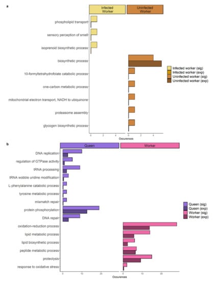 Bar plots depicting the significantly enriched Gene Ontology terms upregulated in (a) ants from parasitized nests: infected workers (left panel) and uninfected workers from parasitized nests (right panel). (b) ants from unparasitized nests: queens (left panel) and workers (right panel). Number of genes annotated with the specific term found in the candidate gene list are depicted (sig) as well as the number expected in a list of this size based on the annotation of the whole transcriptome (exp).