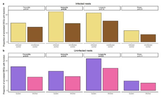 Results of text mining approach of terms related to fecundity, immunity, longevity, and stress based on a UniProt search of upregulated genes in (a) infected workers (yellow) and their uninfected nestmates (brown) of infected nests. (b) Queens (pink) and workers (purple) of uninfected nests. p-value of χ2-test and the according function are given in boxes.