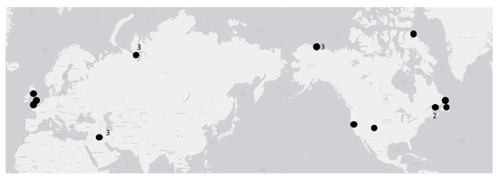 Locations of male red fox samples used in this study (n = 19). One sample from Alaska was genotyped for selected single nucleotide polymorphisms (SNPs) but not sequenced. Numbers refer to the sample size indicated by a marker. Markers with no numbers represent a single sample.