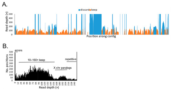 Coverage depths from sequencing reads of 19 red foxes mapped to 37,080 sites of 41 orthologous dog Y chromosome fragments shown (A) with read depths arrayed across ordered sites on the reference fragments and (B) as a frequency distribution, illustrating a systematic pattern of coverage presumably corresponding to uniquely mapping Y chromosome sites (10–160 ×), sites likely to reflect two paralogs (including one on the X chromosome, 161–210 ×) and sites with >2 paralogs (>210 ×). Only sites with depths ranging from 10 to 160 × were used in analyses. Sites with depths of <10 × were presumed to reflect errors and those >160 × were presumed to reflect paralogs, not necessarily all on the Y chromosome.