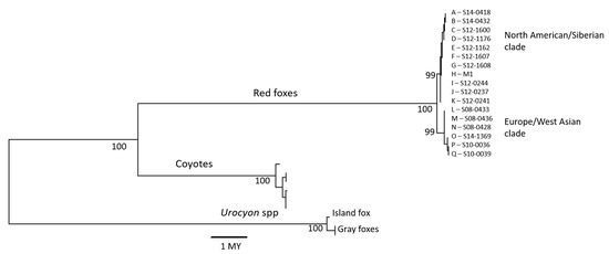 Red fox Y chromosome phylogeny displayed as a maximum likelihood tree inferred from 20,931 bp of sequence in 17 red foxes, 2 gray foxes, an island fox and 6 coyotes with node support inferred from 500 bootstrapped trees. Genetic distance was computed according to the Tamura 3-parameter model [27] and calibrated to divergence time in millions of years (MY). The locations of red fox samples are shown in Table 1.