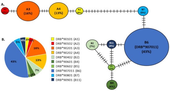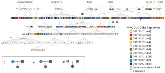 The DLA-DRB1 haplotypes formed two divergent allele lineages (A and B) in the minimum spanning network (Figure 1). Haplotypes within each lineage differed by 2–6 mutational changes, whereas the minimum difference between haplotypes from different lineages (Haplotypes A1 and B7) was 16 mutational changes. Haplotype B6 (also referred to as allele DRB*907011) was the most common (frequency 42.8%, Figure 1). It was detected in 77 (74%) individuals, 12 of which were homozygous, and it was distributed across most family groups. This is illustrated in the pedigree (Figure 2) of dogs included in this study, together with their ancestors and descendants. Other haplotypes ranged in frequency from 1.44% (B5 or DRB*90602, detected in 3 (2.9%) individuals) to 15.87% (A3 or DRB*90201, detected in 33 (31.7%) individuals, three of which were homozygous; Table 1, Figure 1 and Figure 2).
