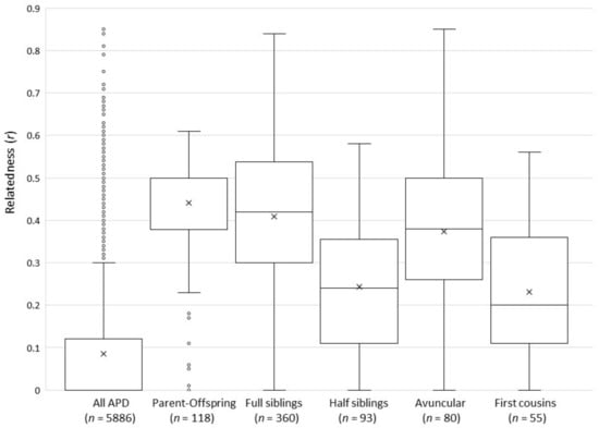 Box and whisker plots of pairwise relatedness coefficients (r) between pairs of APD, including the entire NA sample and five categories of relationships as defined by studbook records. Mean relatedness is indicated by an X within each box; median is indicated by a horizontal line within each box; outliers are shown by open circles above or below whiskers. The numbers of pairwise comparisons conducted within each defined relationship category are indicated in parentheses (n).