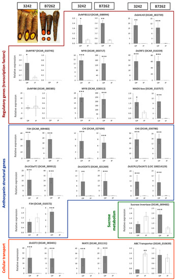 Comparative analysis of transcript levels by RT-qPCR for 19 selected genes in purple outer phloem (OP) (gray bars) vs. non-purple inner phloem (IP) (white bars) tissues from roots of 3242 and B7262 genetic backgrounds. For 3242, roots from a derivative F3 family of 3242-F2 (used for mapping and transcriptomic analyses) were used. Root phenotypes for both genetic backgrounds are shown in the upper-left images. The selected anthocyanin-related genes were consistently differentially expressed in all of the POP vs. NPIP transcriptome comparisons (16 genes), and/or they colocalized with ROPAP and RIPAP in the linkage map, and/or they were previously reported to be involved in the biosynthesis, modification or transport of anthocyanins. Bars indicate mean values for the fold change in gene expression relative to the expression of the internal control gene (actin), as calculated from the ratio ∆Cq-target gene/∆Cq-actin [34] and their standard errors. Asterisks indicate significantly higher gene expression at p < 0.05 (*), p < 0.01 (**), and p < 0.001 (***).