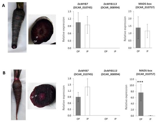 Gene expression analysis (RT-qPCR) of DcMYB7, DcMYB113 and MADS-box (DCAR_010757) in the root purple outer phloem (OP) (gray bars) and purple inner phloem (IP) (white bars) of the carrot inbred line P9547 (A), which is genetically related to 3242, and the Indian cultivar Pusa asita (B). Root phenotypes with cross-sections indicating the OP and IP tissues, and their gene expression profiles are presented. Bars indicate mean values for the fold change in gene expression relative to the expression of the internal control gene (actin), as calculated from the ratio ∆Cq-target gene/∆Cq-actin [34], and their standard errors. Asterisks (***) indicate significantly higher gene expression at p < 0.001, whereas OP vs. IP comparisons without asterisks is not statistically different at p ≤ 0.05. The absence of bars for DcMYB113 indicates that no transcripts were detected.