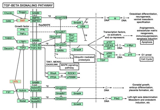 Genes mapping to KEGG pathway for TGF-β signaling pathway (hsa04350) [] with included LEFTY1 and BMP8B genes (red labels).