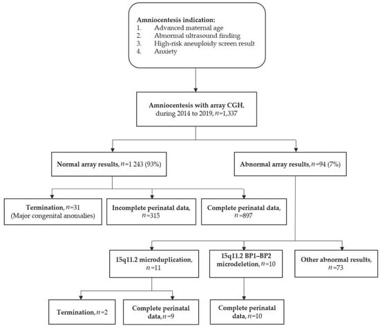 A total of 1,337 prenatal amniocentesis samples were obtained for fetal karyotyping and concomitant CNV using microarray-based comparative genomic hybridization analysis (array CGH) between January 2014 and December 2019 at the Department of Obstetrics and Gynecology, Taipei and Linkuo Branches of Chang Gung Memorial Hospital, Taiwan. A flow diagram and the common indications for amniocentesis are presented in Figure 1. We retrospectively analyzed the results of array CGH and identified 1243 samples with normal array results (1243/1337, 93%) and 94 samples with abnormal array results (94/1337, 7%). Of the 1243 samples with normal array results, 31 cases terminated their pregnancy owing to major congenital anomalies, while 315 cases had incomplete perinatal data; thus, only 897 cases were included in this study with complete perinatal and infantile outcomes. Meanwhile, of the 94 samples with abnormal array results, 21 cases had 15q11.2 BP1–BP2 CNV. Karyotype and array CGH did not identify other chromosomal aneuploidies or alterations in these 21 cases. Of these cases, 10 samples had 15q11.2 BP1–BP2 microdeletion and 11 samples had 15q11.2 microduplication. Two cases with microduplication chose to terminate their pregnancy during the second trimester. Thus, data of only 10 cases with 15q11.2 BP1–BP2 microdeletion and nine cases with 15q11.2 microduplication were ultimately analyzed for perinatal and early life outcomes in this study. We compared maternal demographics, pregnancy characteristics, and perinatal and early life outcomes between (1) 15q11.2 BP1–BP2 microdeletion, (2) 15q11.2 microduplication, and (3) normal array results.