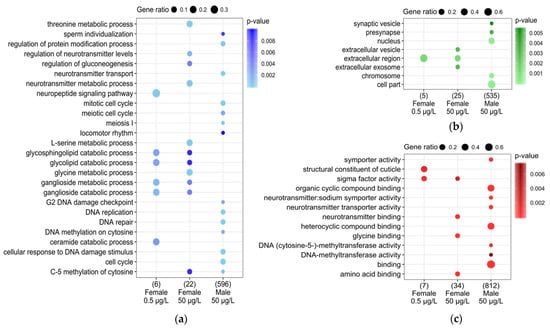 Dotplot of the main GO terms highlighted after the functional enrichment in females and males exposed to 0.5 and/or 50 µg/L of TEB. The functional analysis was performed in three aspects, i.e., (a) biological process, (b) cellular component, and (c) molecular function. GO terms were considered enriched with a Fisher’s exact test p-value ≤ 0.01. Dot size, i.e., gene ratio, is the ratio between the number of genes in a given GO term to the total number of mis-regulated genes considered in the GO enrichment analysis (indicated in parentheses on the dot plot).