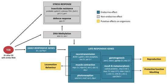 The data produced by the transcriptomic analysis allowed the identification of potential biomarkers, including genes specific to the ecdysone receptor agonist MoA as ecdysone early genes, as was proposed in Gammarus fossarum []. These specific precocious candidates should be complemented by late genes to deploy a battery of biomarkers to accurately identify exposure to ecdysone agonists. Thus, in this study, genes that code for proteins involved in the metabolism of the cuticle and genes involved in the neuromuscular pathways were mis-regulated in both sexes, probably through the action of TEB on early genes. The above-mentioned results are consistent with those of previous studies on the effects of ecdysone receptor agonists on arthropods; effects that lead to the development of an adverse outcome pathway (AOP). Researchers consider early genes as the first key molecular event to result in late key events linked (among others) to impairment of the moulting and neuromuscular system at the tissue/organ level to the final adverse outcome in individuals []. Furthermore, down-regulation of vtg could be an appropriate biomarker for effects of ecdysone receptor agonists (although not for feminisation), as the vtg expression is potentially controlled by ecdysteroids []. Together with the above-mentioned potential markers of ecdysone receptor agonists and exposure to insect growth regulators, our results highlight more “classical” indicators of stress, such as genes involved in defence against oxidative stress, DNA repair, insecticide detoxification, and resistance. The present study additionally highlighted genes that code for proteins involved in DNA methylation and histone modification. These genes could be considered biomarkers for epigenetic modification. The present study also allowed the detection of putative physiological responses, which could guide future investigations on higher biological levels: (i) alteration of the cuticle protective function or moulting process, (ii) behavioral impairments, and (iii) reproductive issues. Figure 3 summaries the data obtained by the transcriptomics analysis and presents potential links between gene mis-regulation and potential effects at higher biological levels. Finally, this study reinforces the suitability of the use E. affinis as an appropriate ecotoxicological model and reinforces the importance of sex as a factor to be considered in ecotoxicogenomics.