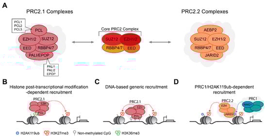 Mammalian PRC2 complexes are relatively homogenous at their core when compared with PRC1, and contain, at their heteromeric core, a SET domain containing histone methyltransferase, EZH1 or EZH2, together with EED and SUZ12 [,]. Similar to RING1A/B, EZH1 and EZH2 are also mutually exclusive in the assembled PRC2 complexes [,]. All three core subunits are required for the methyltransferase activity of EZH1/2 towards the catalysis of H3K27me1/2/3 []. The EED subunit can recognize H3K27me3 and thus contributes to genomic self-propagation of the PRC2 complex and H3K27me3 deposition [,]. A fourth core subunit of the histone binding proteins, RBBP4 or RBBP7, is important for the PRC2 complex genomic stabilization [,,]. Additional biochemical analyses have revealed that PRC2 complexes can be further divided into two mutually distinct PRC2 complexes termed PRC2.1 and PRC2.2 [,], depending on the assembly of additional accessory subunits (Figure 2A).